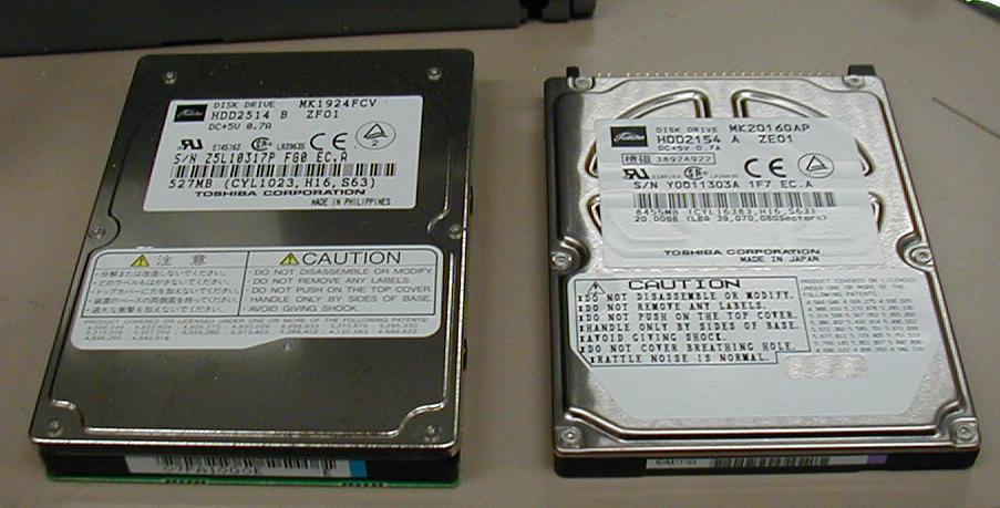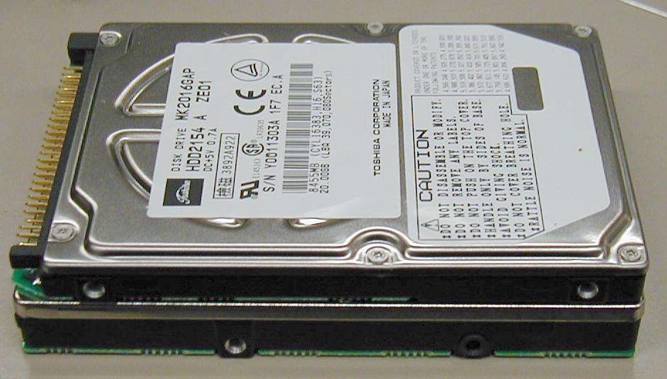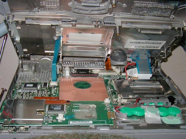 ハードディスクは東芝の 2.5 inch 525 MB のが蓋のほうに固定されていて、本体のほうにコネクタ がある。従って、蓋を外した時にむりやりにコネクターが抜かれたことになる。考えてみるとこれはきっと正しい抜き方ではないな。どうやって先に蓋から HD を外すんだろ?というようなことは深く考えないで、ディスクを蓋に固定しているネジをはずして本体のコネクタに戻してみる。で、蓋をかぶせて(固定はしないで)動作チェック。別に問題なく動く。