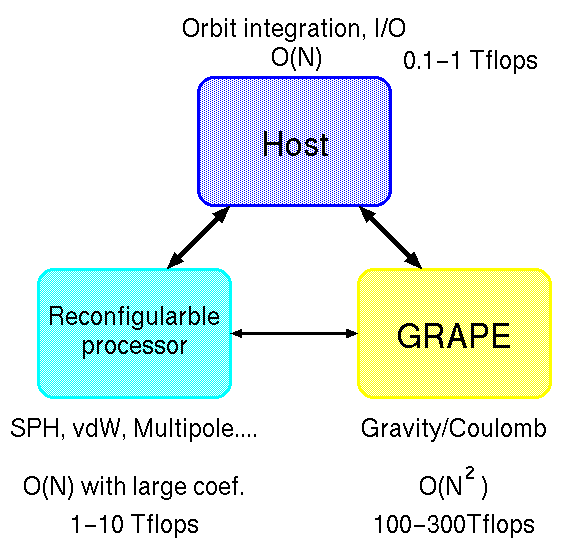 粒子系のシミュレーションにおいて長距離力の計算が十分に高速化されると、 次に問題になるのは比較的到達距離の短い短距離相互作用である。時間積分、 結果の解析、入出力等は相互作用計算に比べてさらに計算量が小さく、汎用計 算機で十分賄うことができる。