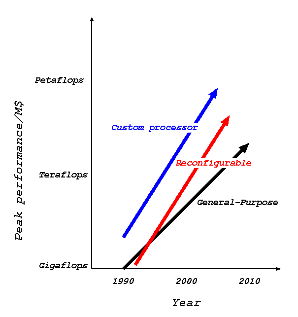 しかしながら、短距離相互作用は問題に応じて多種多様であり、そのそれぞれ に対して専用プロセッサを開発するのは開発コストからみて現実的とはいい難 い。そこで、この部分の高速化のためにはFPGAを使った再構成可能計算機を開 発する。FPGAのコストパフォーマンスは単純比較では専用プロセッサに比べて 2桁近く劣るが、汎用プロセッサに比べれば桁違いに高い性能が達成できる。