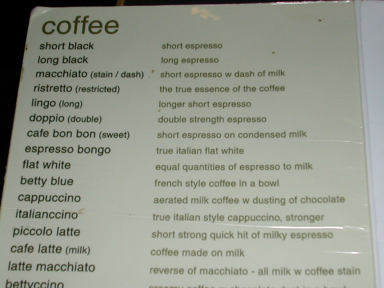 空港にあったコーヒー屋のメニュー(2)