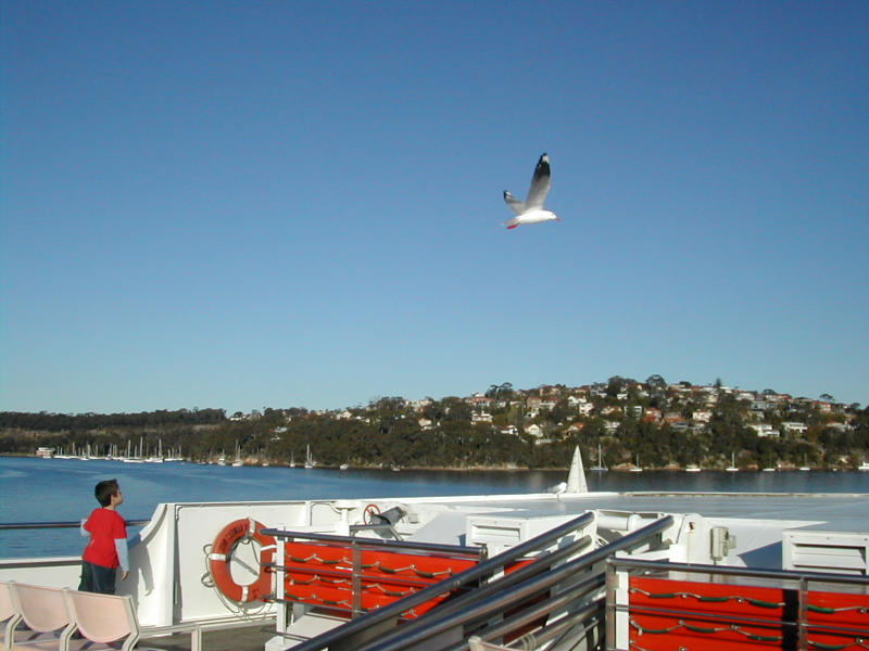 Cruise している船につきまとっていたカモメ。デジタルカメラが古くて、シャッ ター押してから実際にとれるまでの時間が無限に長いのでこの手の写真を撮る のは極めて困難。