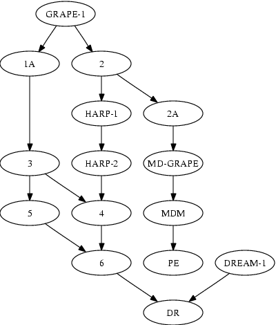 digraph GRAPES { size="8,8"; node [fixedsize=false,width=1.2]; "GRAPE-1" -> "1A"; "GRAPE-1" -> "2"; "1A" -> "3"; "2" -> "2A"; "2" -> "HARP-1"; "3" -> "4"; "HARP-1" -> "HARP-2"; "HARP-2" -> "4"; "3" -> "5"; "4" -> "6"; "5" -> "6"; "2A" -> "MD-GRAPE"; "MD-GRAPE" -> "MDM"; "MDM" -> "PE"; "6" -> "DR"; "DREAM-1" -> "DR"; }から、こんなの