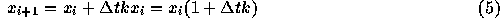 x = 1; dt = 1.0/n; for(i=0;i<n;i++){ x = x + x*k*dt }例えば C で書けばこんな感じだろう。丸め誤差の結果、答がどう変わるかと いうことを考えてみる。