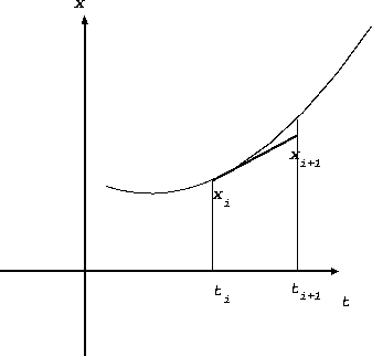 上の図に様子を示す。ここでは、真の解(がわかっているものとして)を曲線 で示し、そこから出発したとした。