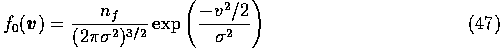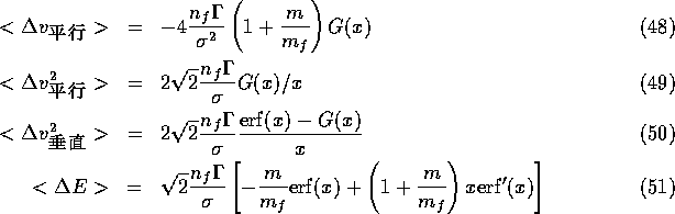 さて、以下ではバックグラウンドの粒子分布のもとでの一つのテスト粒子の振 舞いを考える。3.1節と違うのは、バックグラウンドも動いていることと、テス ト粒子も有限の質量を持つことである。バックグラウンドの粒子は一様に分布 するものとし、ある速度分布に従うとする。さらに、バックグラウンドの粒子 間の相互作用とかは考えないことにする。これで本当にいいかどうかはちょっ と良くわからない問題であるが、まあ、とりあえずやってみることにしよう。