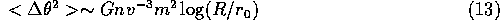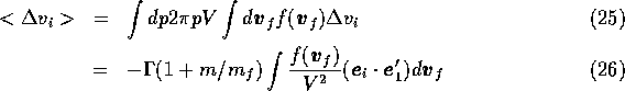 で与えられる。ここで、この曲がる角度は相対軌道のものであって、テスト粒 子の軌道のものではないということに注意する必要がある。いきなり回りが動 いていてしかもテスト粒子が質量をもつというのは面倒になるので、とりあえ ずテスト粒子は質量を持つが、回りは止まっている場合を考える。この時、一 回の散乱での速度変化は以下の式に従う。