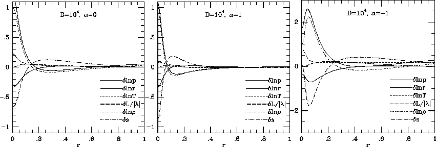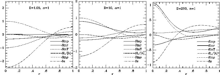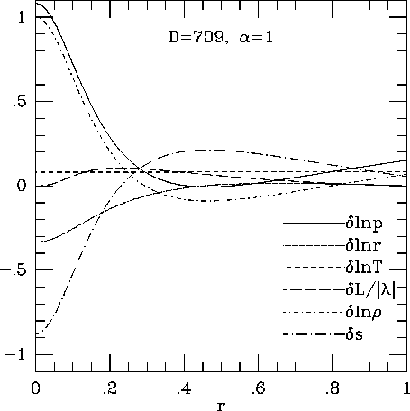 さて、少し中心密度を上げると、摂動に対する圧力の応答が変わって、中心で 圧力が上がるようになる。これは、熱を奪われることに応答して縮むと、重力 も強くなるので、つじつまをあわせるにはもうすこし縮んで圧力を上げる必要 が起きるからである。このために、温度の応答は与えたエントロピーからず れてくる。もっとどんどん温度をさげて、Dを大きくすると、ついには、熱 を奪ったにもかかわらず、温度が中心でも上昇するようになる。