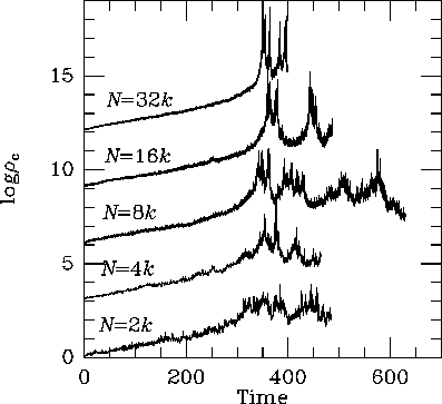 しかし、 1983 年になって、 杉本とベトウィーザー [SB83]は、実はこのホモロガスな膨張解も熱力学的に不安 定であるという発見をした。そのあと数年に渡る論争があったが、1985 年には他のグループによるガスモデル計算、1986年には FP計算でも振動 が確認された。実際に粒子系でそんなものが起きるかどうかにはさらに 議論があったが、1995年になってN体数値計算でも確かに振動が起きる ということが見い出された[Mak97]。図5に結果を示す。縦軸は中心密度 である。粒子数が違う計算結果は適当に縦にずらしてある。横方向は、緩和時 間がほぼ等しくなるようにスケールした時間である。