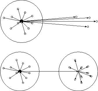 と、いうことで、以下の話の本題であるツリー法系の計算法の話にはいる。ツ リー法の基本的な考え方は、計算量を減らすために重力を及ぼす遠くの粒子を 適当にまとめるということである。まとめるのに、階層的な木構造を使うこと で、どの粒子に対しても小さなコストでうまいまとめ方を構成する。