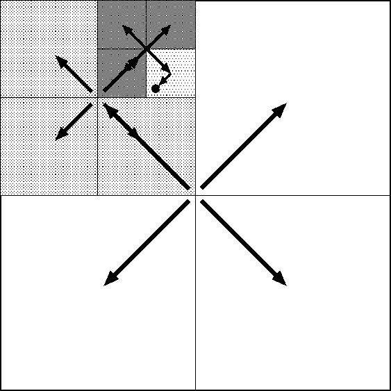 図で説明しよう。3次元の図は書きにくいし見る方も見にくいであろうから、2 次元で書くことにする(図10)。まず、平面内の適当な領域に粒子が分布して いるとしよう。粒子が有限個なので、そのすべてを含む正方形を考えることが 出来る。すべて含んでいればよいので、別に最小である必要はないが、普通は そこそこ小さくとる。これを、まず4つの小正方形(セル)にわける。で、その それぞれをさらに4つにわけるというのを再帰的に繰り返していく。
