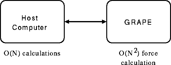 専用回路の側は相互作用を計算するだけである。我々はこちらの部分に GRAPE (GRAvity PipE) という名前をつけている。とりあえず、もっとも単純な 直接計算で時間刻み一定の場合を考えると、専用計算機としては例えば系の全 粒子を受けとって自分のメモリにしまい、それから2重ループで全粒子への他 の全粒子からの力を計算する。最後に求まった力を送り返す。