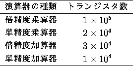 ある。これに対し、浮動小数点演算器を構成するのに必要なトランジスタの数