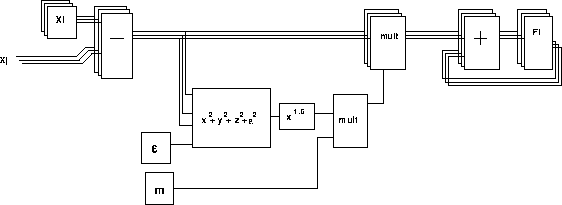 この並列性は既に単一のチップの話をする時に利用しているわけで、パイプラ イン化できるのは力を及ぼす方がある程度多いからであり、また複数パイプラ インを並列動作させられるのは力を受ける側が複数あるからである。パイプラ イン段数はせいぜい 100 段程度なので、粒子数が100万とかいっているときに はほとんど無視できる。従って、一つの粒子への力をさらに 100 とか 1000 チップにわけで、並列に計算してもパイプライン遅延は問題にならない。もっ とも、1000 もパイプラインがあるとそれを順番に合計していったのでは時間 が掛かり過ぎるが、これはトーナメント方式で合計すれば2入力の加算器を使っ たとして 10 段、 4 入力のものを特別に設計すれば 5 段のツリー構造ネット ワークで済む。さらにこの全体がパイプライン化できるので、段数が多くても 性能にはそれほど影響しない。 こういった回路は、規模的には現在の FPGA に容易に収まる。