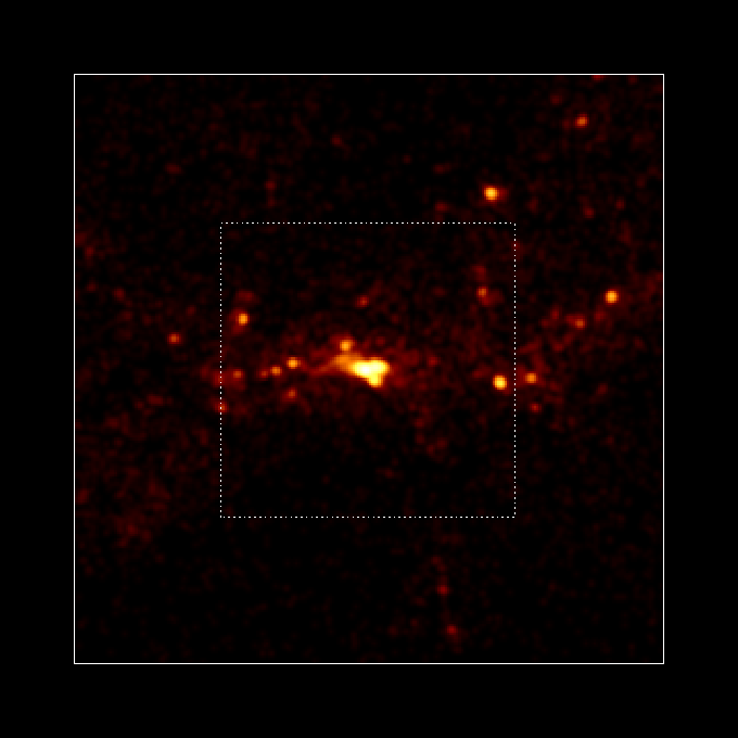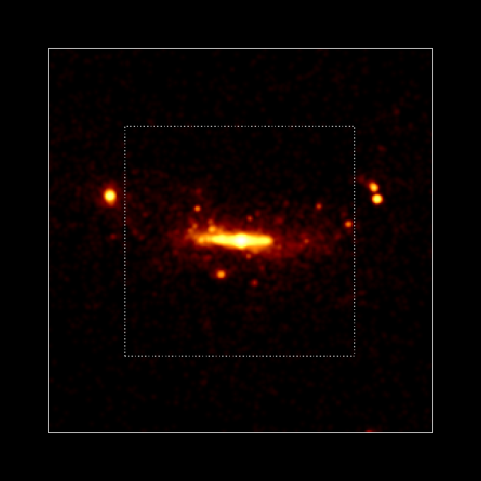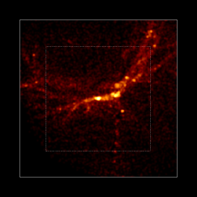 - 上の図からそれぞれ、縦横150Kpc、100Kpc、50Kpc、30Kpcと中心部を拡大していきます。点線は次の図の大きさを表しています。